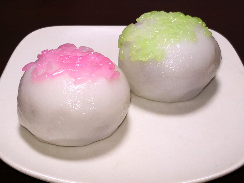 本当は上のもち米の色は、赤、緑、黄色の3色で、本来ならば黄色のまんじゅうもあるのだが、さすがに3つも食べるのは辛く、ふたつだけの写真である。