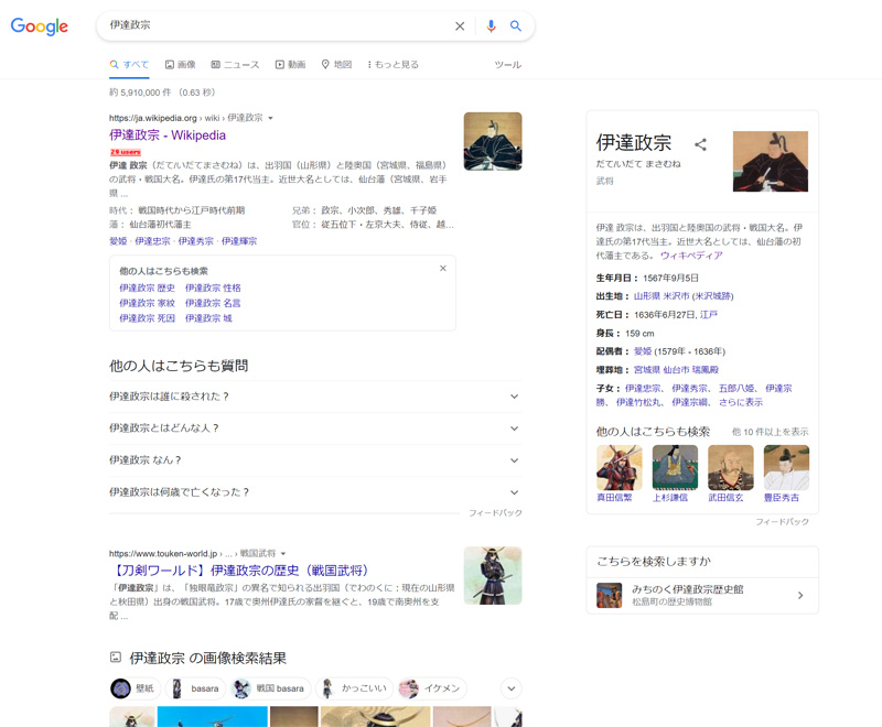 私のGoogleの検索でも最初どころかほとんどがこちらの17代目当主の伊達政宗関連のページになる。おそらくほとんどの人が同じだろう。